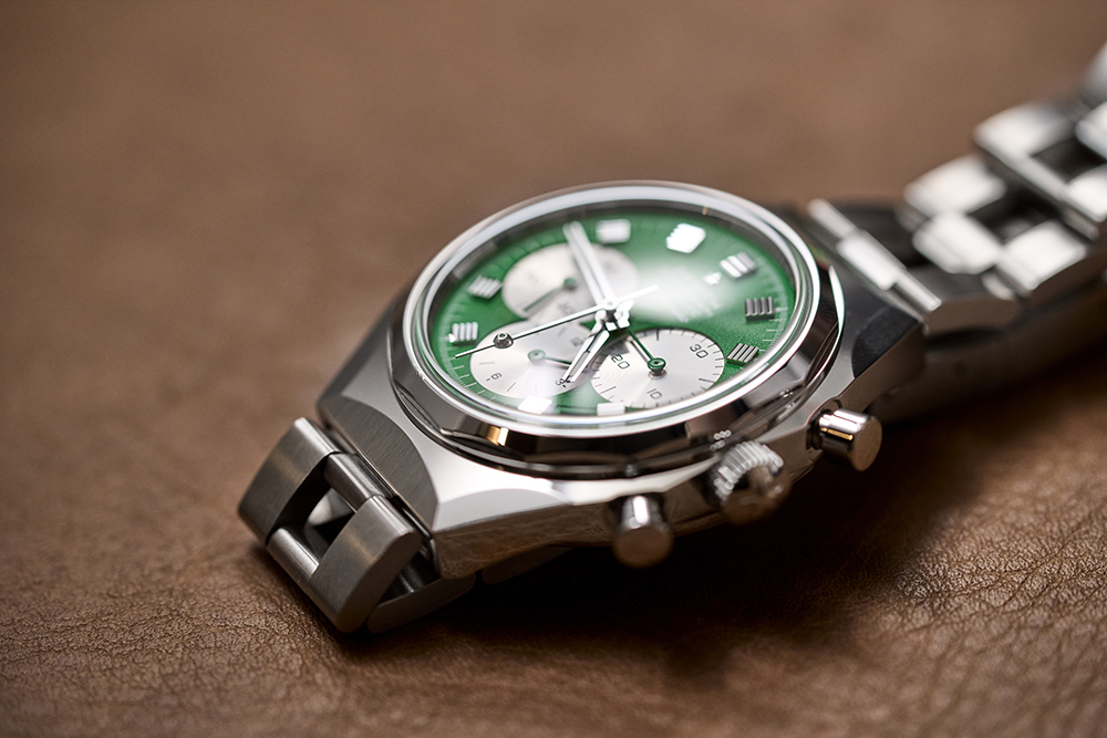 那表盘这边依旧是特色的冰川纹,不以光滑取胜,看上去有点像陨石盘。做这样一个表盘要30天时间。还好同时有很多表盘在一起做,否则价格我估计买不起。今年的变化在于,做出了晕染的效果,四周加深,比之前的冰川有更微妙的变化。